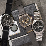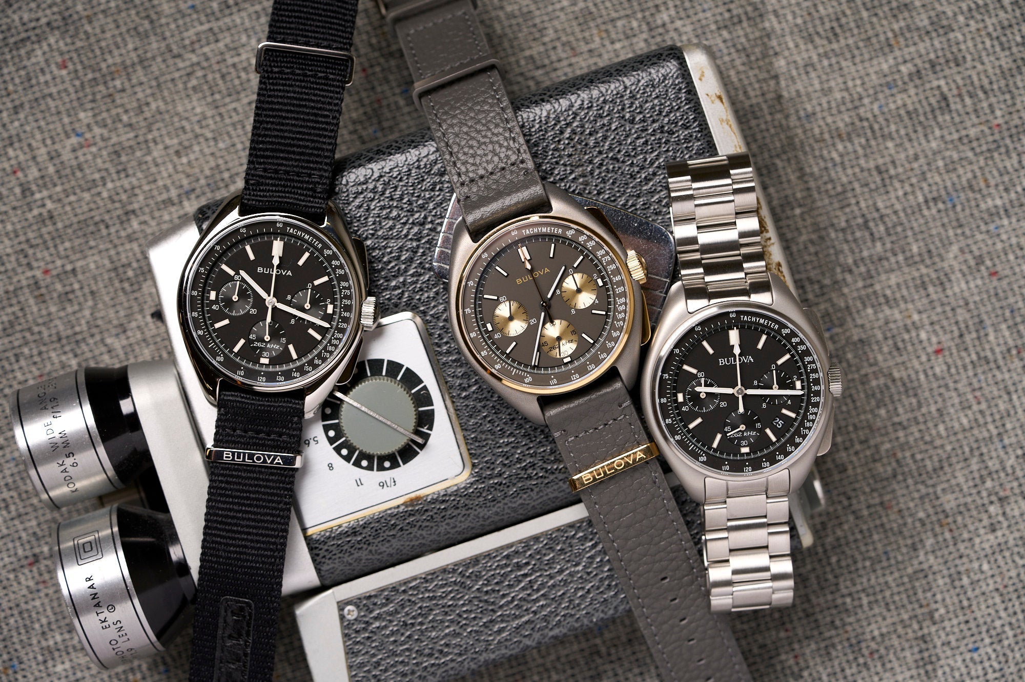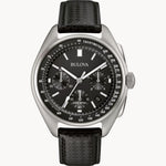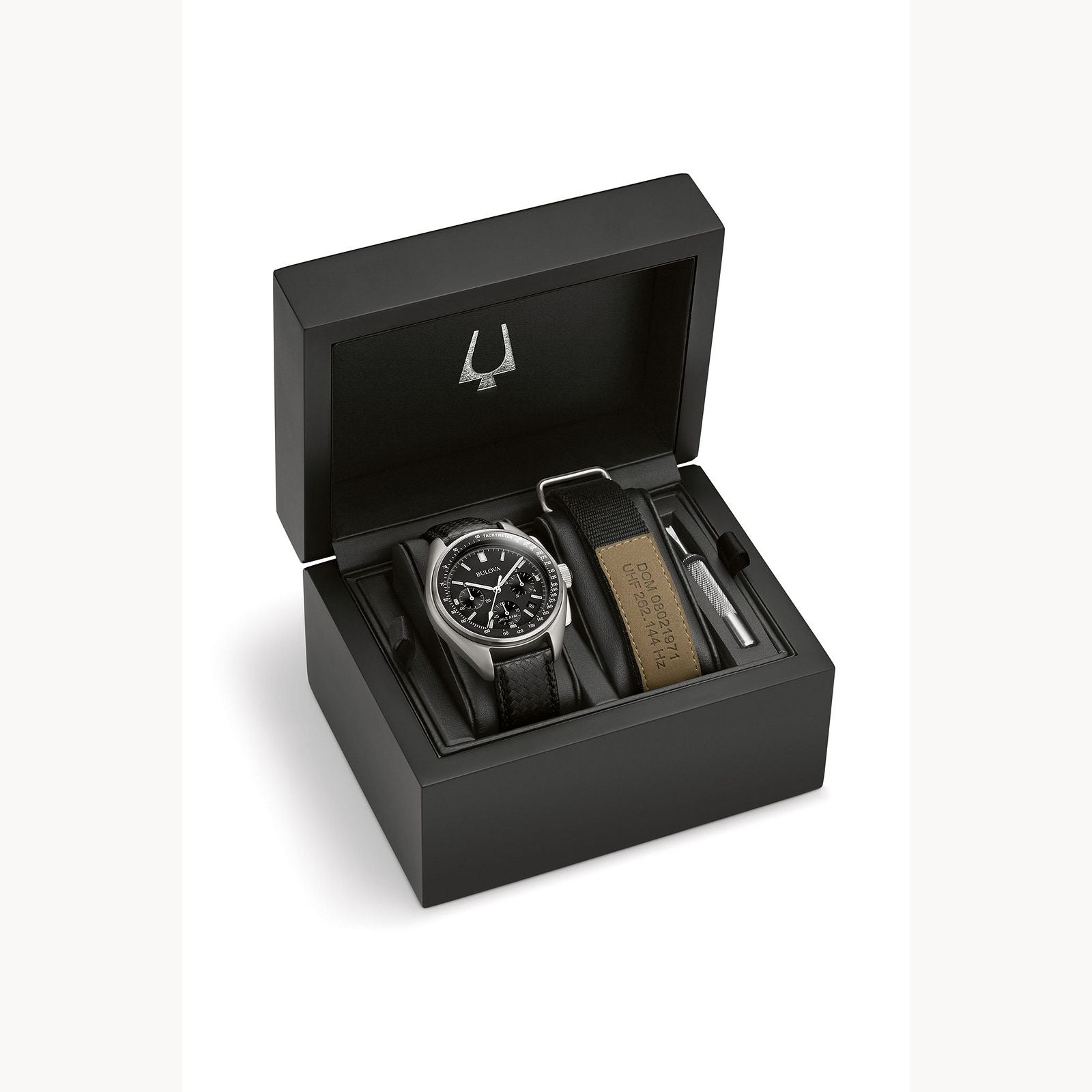 After Apollo 15 s mission commander made lunar history while wearing his personal Bulova chronograph we re making history again. The Bulova Moon Watch replicates that original timepiece, updated with our exclusive high performance quartz movement with a frequency of 262 kHz for unparalleled accuracy, continuing a history of precision timing. In stainless steel screw-back case in silver-tone finish and black dial, sapphire glass, and interchangeable black leather and nylon straps with three-piece buckle closure, and water resistance to 50 metres.