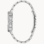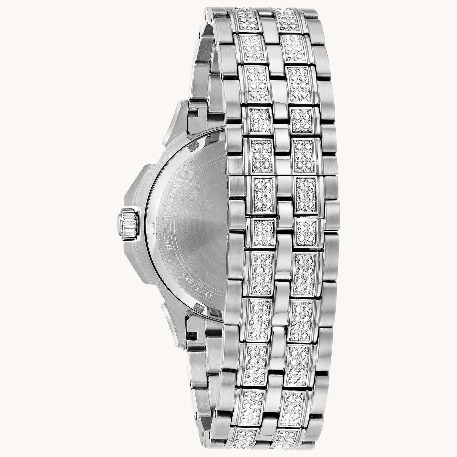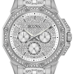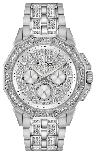 Multi-function dress watch boldly embellished with 300 Swarovski Crystals on the stainless steel case and bracelet, and the pave set six-hand silver white dial. Flat mineral crystal, deployant closure, quartz movement, and water resistance to 30 meters.