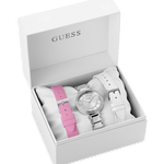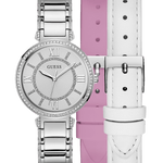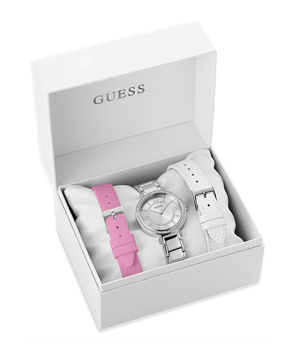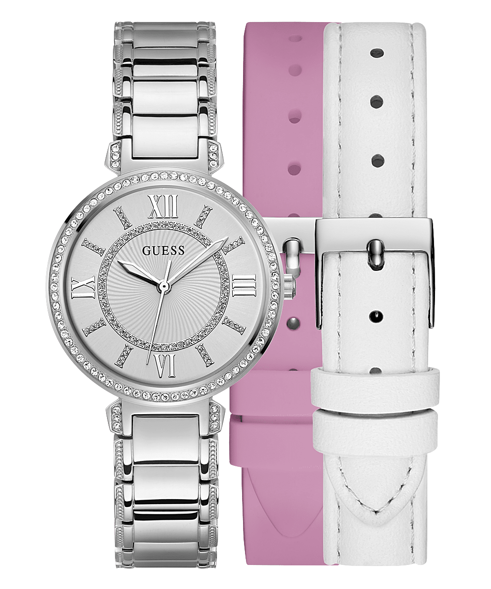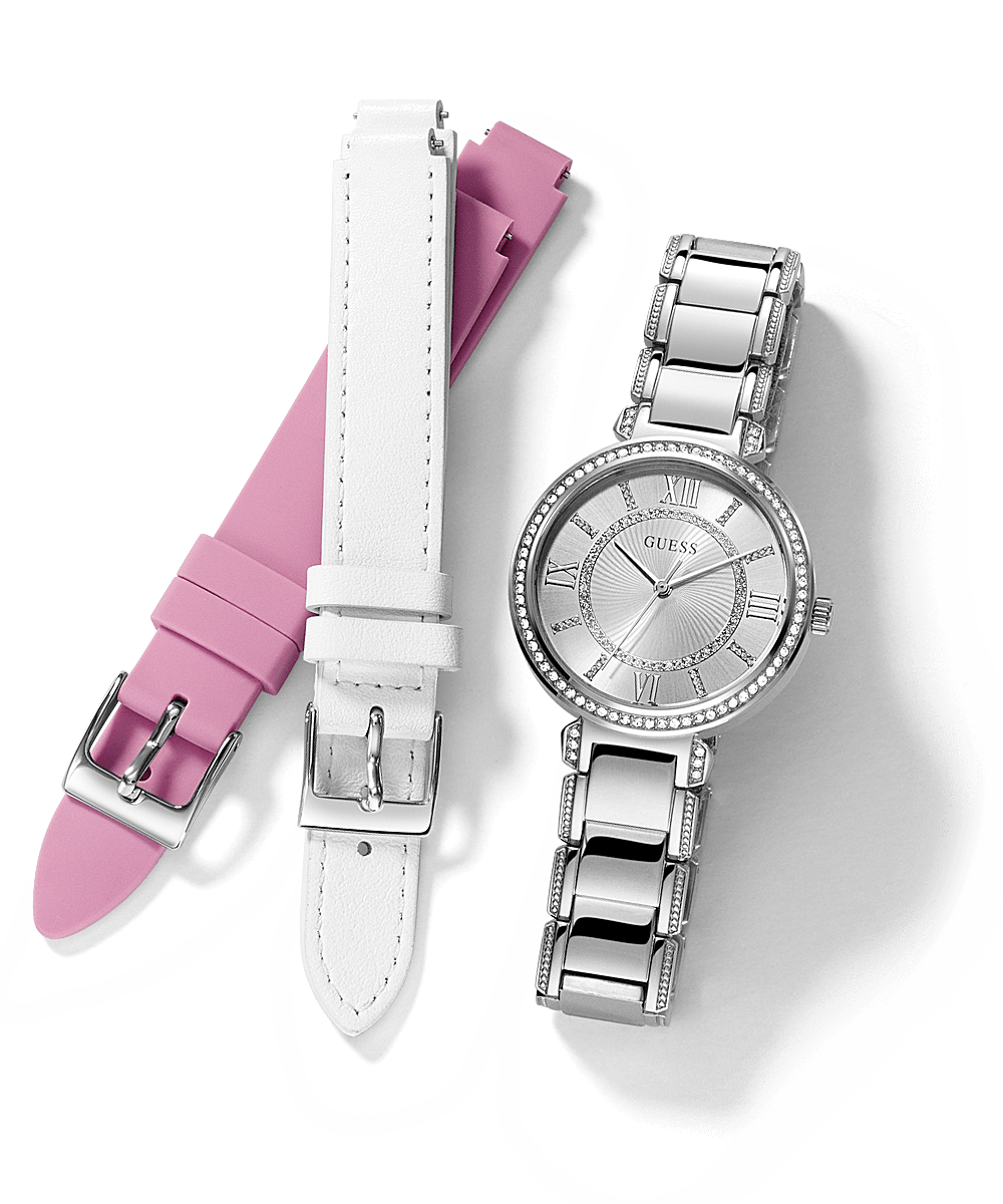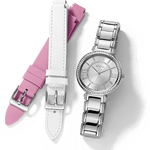 A watch wardrobe that gives you the versatility of a bracelet, silicone strap as well as an ethically sourced leather with ultra-suede backing that are all interchangeable on this great fully glitz crystal look with a dressed up 3H dial.