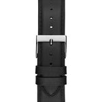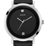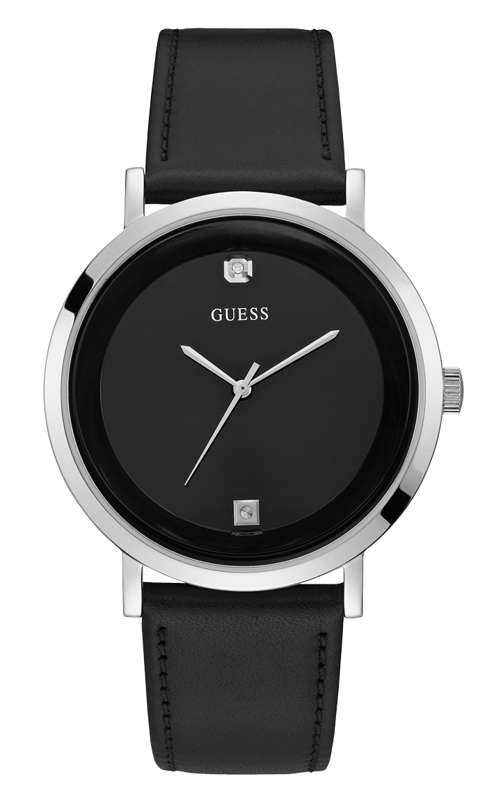 A slick watch featuring a black analog dial with diamond accent surrounded by a silver-tone bezel. Finished with a leather strap with buckle closure.