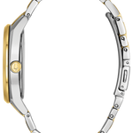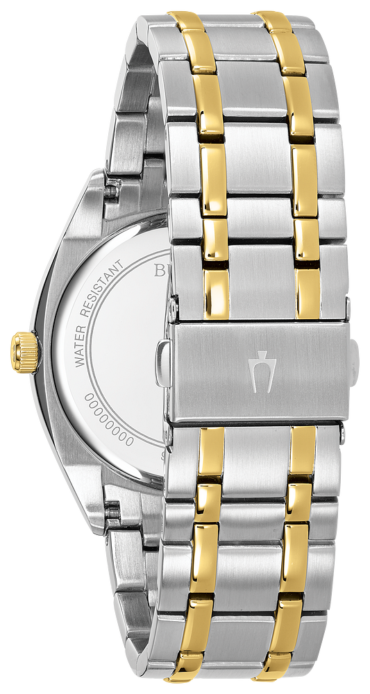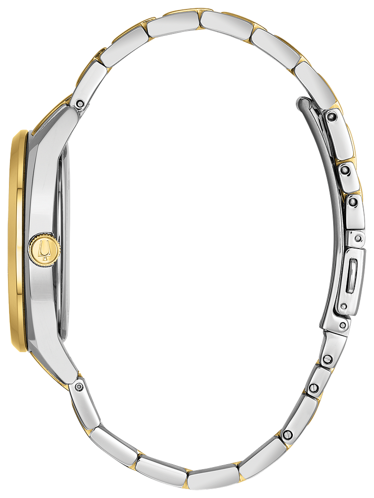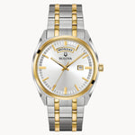 From the Classic Collection. Two-tone gold stainless steel case with new three-hand day/date feature, silver-white dial with gold-tone hands and markers, domed mineral glass, and gold-tone and stainless steel bracelet with short fold-over double-push closure.