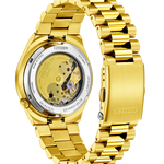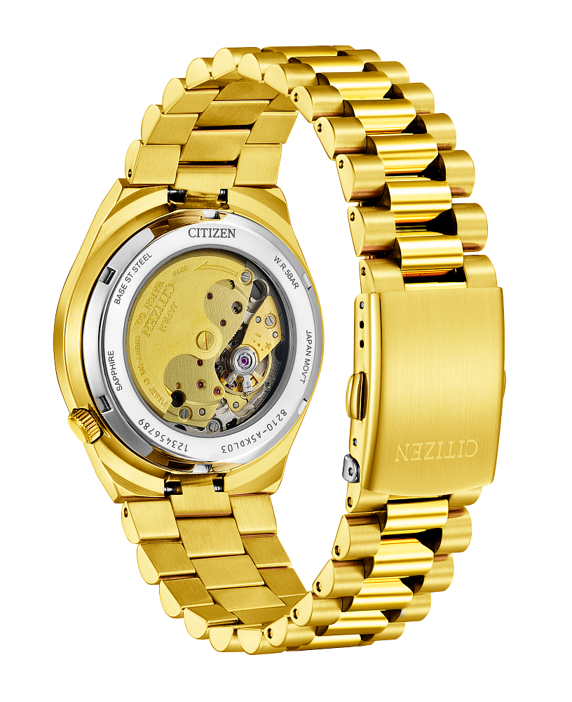 The "Tsuyosa" Automatic, from the NJ015 series, brings ultramodern sports styling right to your wrist. Executed in a versatile 40mm footprint, the sophisticated design of the watch makes a strong impression via a gold-tone stainless steel case and a seamlessly integrated, matching bracelet. Underneath an anti-reflective sapphire crystal, the sporty timepiece makes use of a sunray green dial, with a 3 o clock date window and contrasting gold-tone details adding to its classic aesthetic. Powered by an automatic movement and offering up to 50 metres of water resistance, the refined timepiece is a daily wearing choice ready for work, play, and everything in between. Calibre 8210.