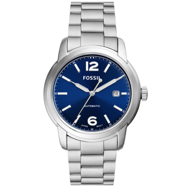 This 43mm Fossil Heritage features a blue sunray dial, automatic movement and stainless steel bracelet.