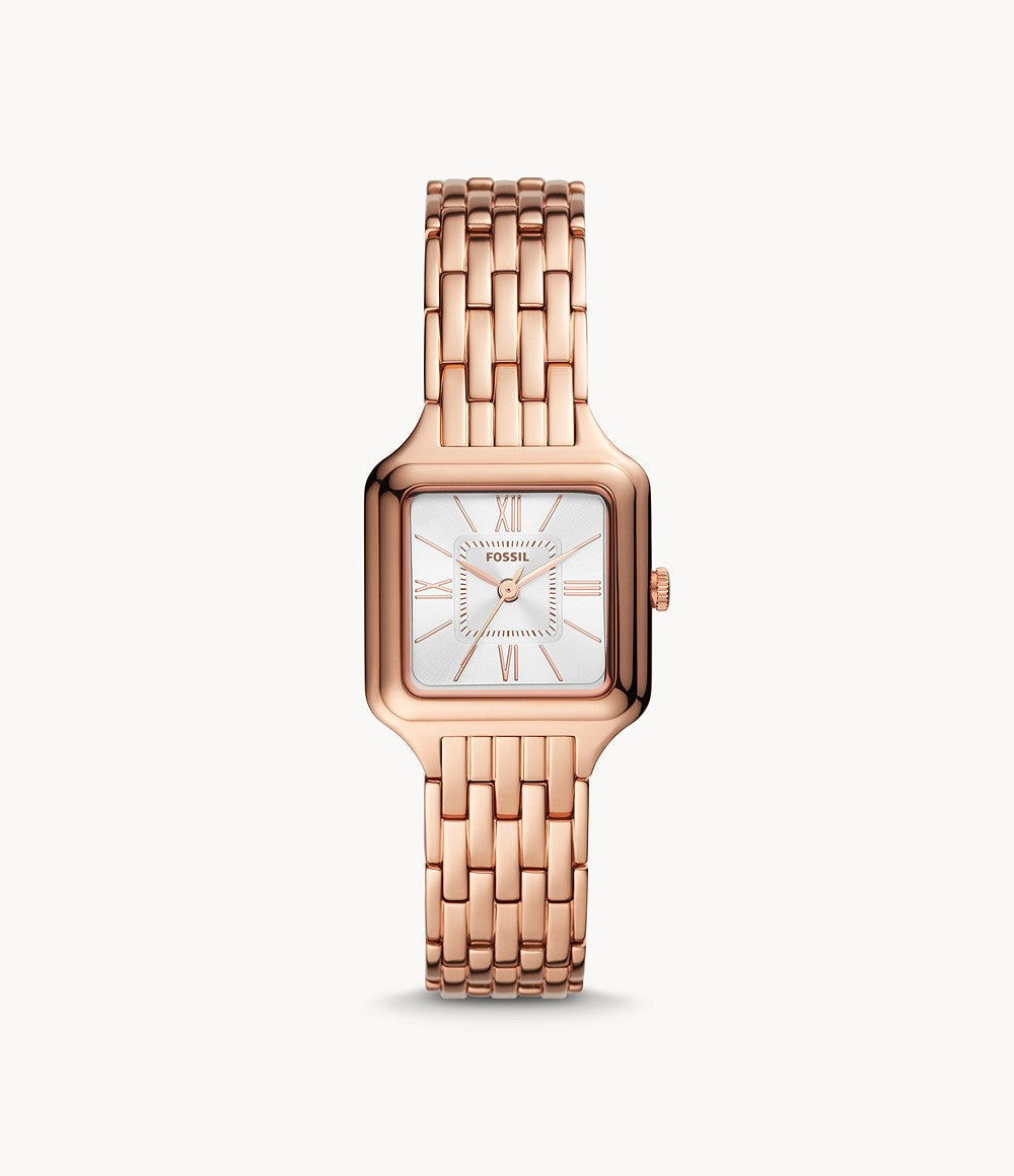 This 27mm Raquel features a silver satin dial, three-hand movement and rose gold-tone stainless steel bracelet.