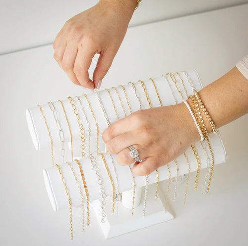 Prices for bracelets start at $45 for sterling silver chains and $155 for 10K solid gold. They may go up depending on the style and if any charms are added. All necklaces and anklets are priced by the inch. All prices include the jewellery & service.