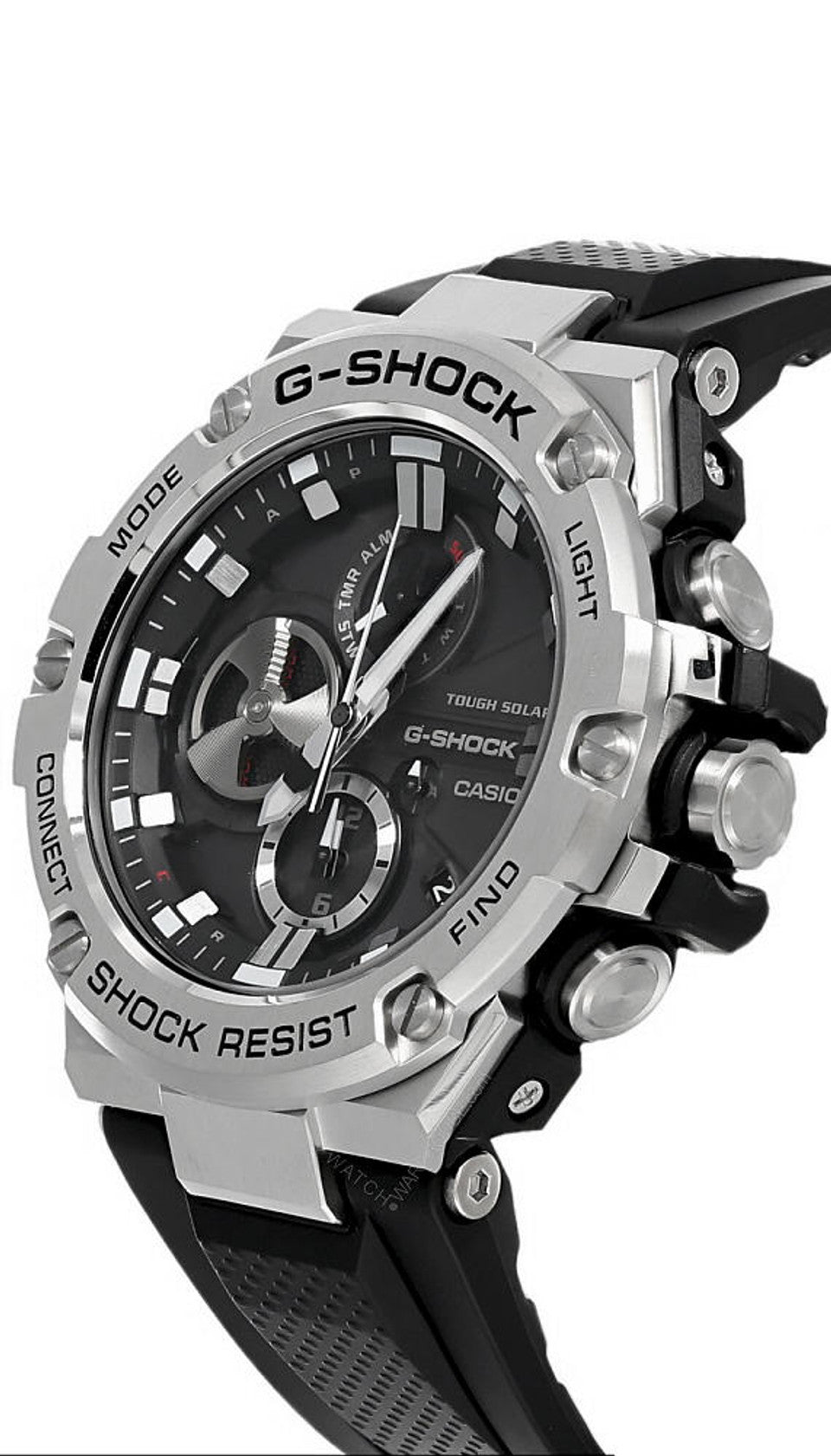 The G-Shock watch that always strives for toughness, the G-Steel lineup models to offer chronograph performance in analog format. Though all the dials of these models are analog, they still boast G-Shock level shock resistance. A layer guard structure houses resin cushioning parts inside the case, for a more elegant design and a better fit to the wrist. High-density mounting technology makes it possible to create a module that is smaller and thinner, which also contributes to a better fit.