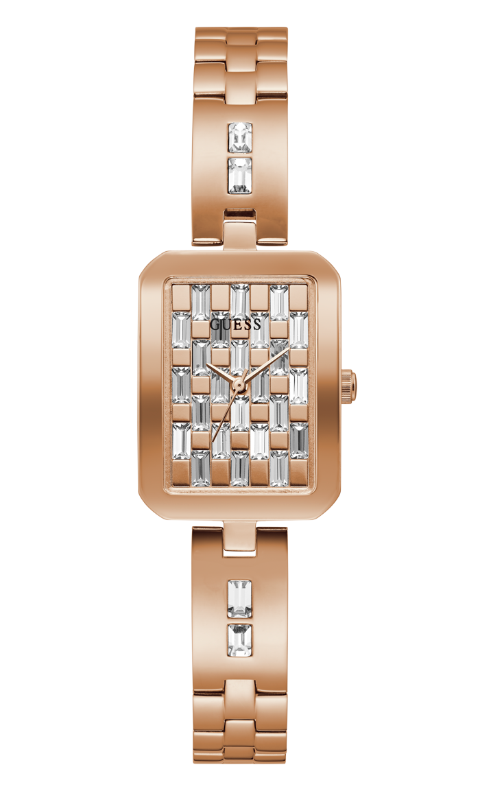 Layer on the glitz with this beautiful timepiece that features baguette crystals on the dial and on the bracelet