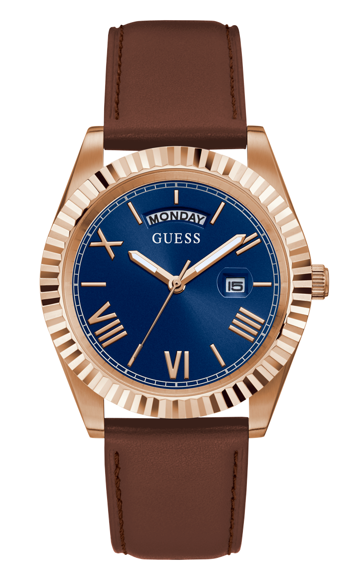 A classic look that never gets old. This coin edge bezel is integrated with a smooth leather strap and features a day of the week window at the 12 o'clock hour with a bubble date at the 3 o'clock. **This leather strap is backed by recycled ultra suede.**
