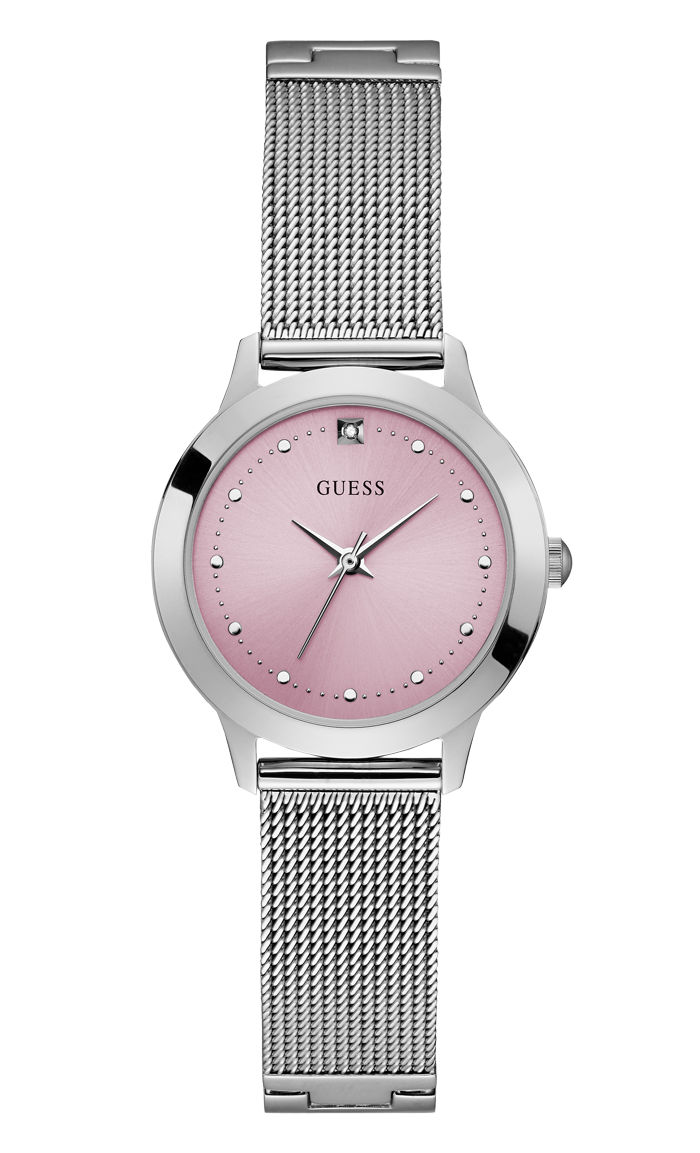 Add a feminine touch to any look with this silver-tone analog watch. Complete with a stainless steel mesh bracelet, a pink dial and a logo detail. Genuine diamond embellishments.