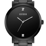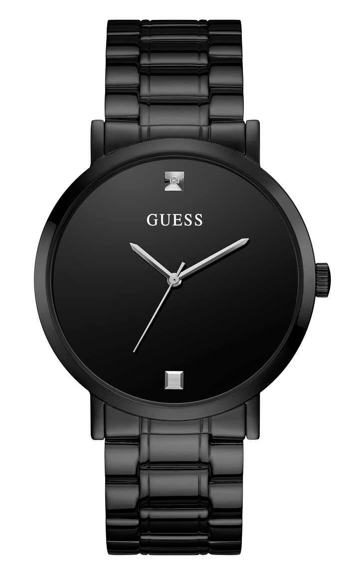 Simple, sleek and sophisticated, this all-black timepiece features genuine diamond markers. Polished steel case and bracelet.