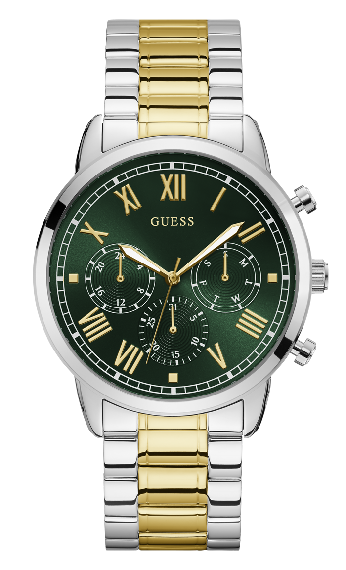 Roman numerals top off the slick green dial of this analog watch featuring a silver-tone case and bezel, complete with a two-tone three-link bracelet. Multifunctional dial with day, date and 24-hour international time.