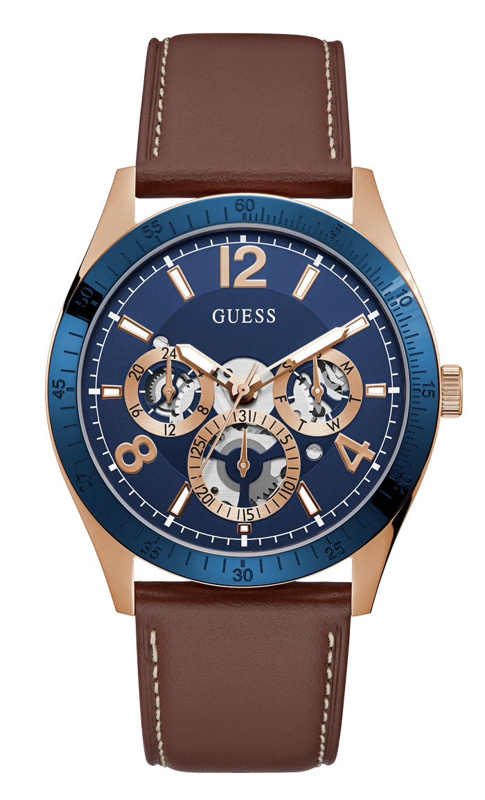 Casual yet refined, this rose gold-tone watch features a multifunction blue dial and smooth leather strap.