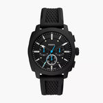 Inspired by classic American machinery, the Machine Chronograph commands attention with its bold knurled topring. Unmistakably masculine with a bold 44 mm case housing a brushed black dial with textured details, all protected by a mineral crystal face. Powered by a precision quartz chronograph movement, this rugged timepiece is built to last with a durable black silicone strap. A true statement in industrial-inspired design.