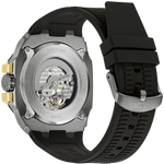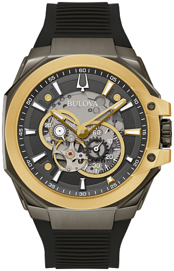 The translucent centre dial and its aperture offer a glimpse at the timepiece s beating heart: an automatic 21-jewel movement with a power reserve of 42 hours. The watch is paired with a rugged silicone strap with a secure 3-piece buckle closure. Combining Marc Anthony s stylish edge with Bulova s precision, this new Bulova men s Maquina timepiece is the perfect companion for those who want to make a statement. Calibre: 82S7