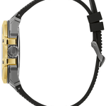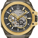The Bulova men s Maquina collection gets the Marc Anthony treatment, with the iconic performer adding his personal touch to the modern design. A boldly distinct stainless steel case features grey and gold IP plating, with a daringly faceted silhouette. The multilayered grey dial features luminescent paint on its markers and its skeletonized hands, with gold-tone accents around a 24-hour subdial and a running seconds subdial.