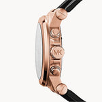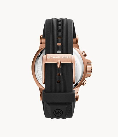 This stunning black silicone Michael Kors chronograph has a rose gold-tone case and a black dial.