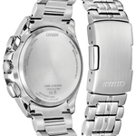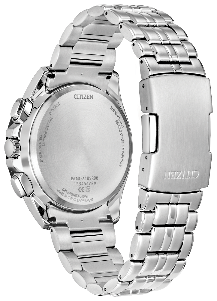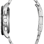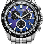 Citizen’s UNITE with BLUE Perpetual Chrono A-T features a 43mm silver-tone stainless steel case, 5-link bracelet, tachymeter, and world-time bezels. Its recycled polycarbonate dial blends ocean-inspired blues, greens, and purples with a 3-register chronograph, day/date, and luminous accents. Powered by Eco-Drive (Cal. E660), it offers atomic timekeeping in 24 time zones, a 60-minute chronograph, perpetual calendar, 12/24-hour time, alarm, and power-reserve indicator. Water resistance: 100m.