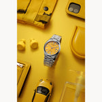 The "Tsuyosa" Collection brings ultramodern sports styling right to your wrist. Executed in a versatile 40mm footprint, the sophisticated design of the watch makes a strong impression via a silver-tone stainless steel case and a seamlessly integrated, matching bracelet. Underneath an anti-reflective sapphire crystal, the sporty timepiece makes use of a sunray yellow dial, with a 3 o clock date window and contrasting silver-tone details adding to its classic aesthetic. Powered by an automatic movement and offering up to 50 metres of water resistance, the refined timepiece is a daily wearing choice ready for work, play, and everything in between. Calibre 8210.